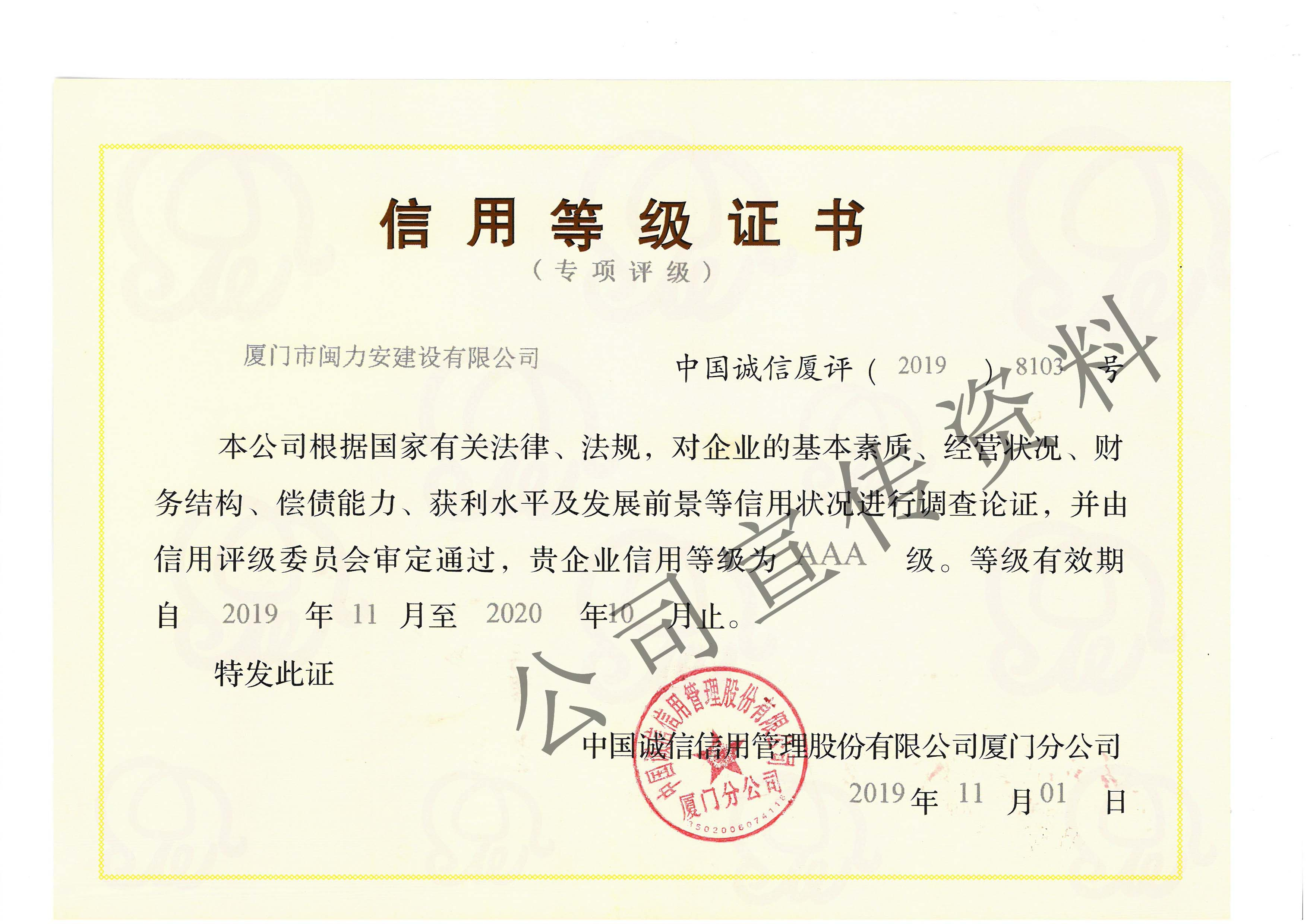 祝賀閩力安取得:信用等級證書